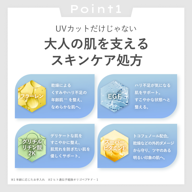 ヒトオリゴペプチド-1。 新世代エイジングケア(※)成分でタンパク質の一種で、美しい肌へ導くと言われています。 ※年齢に応じたスキンケア